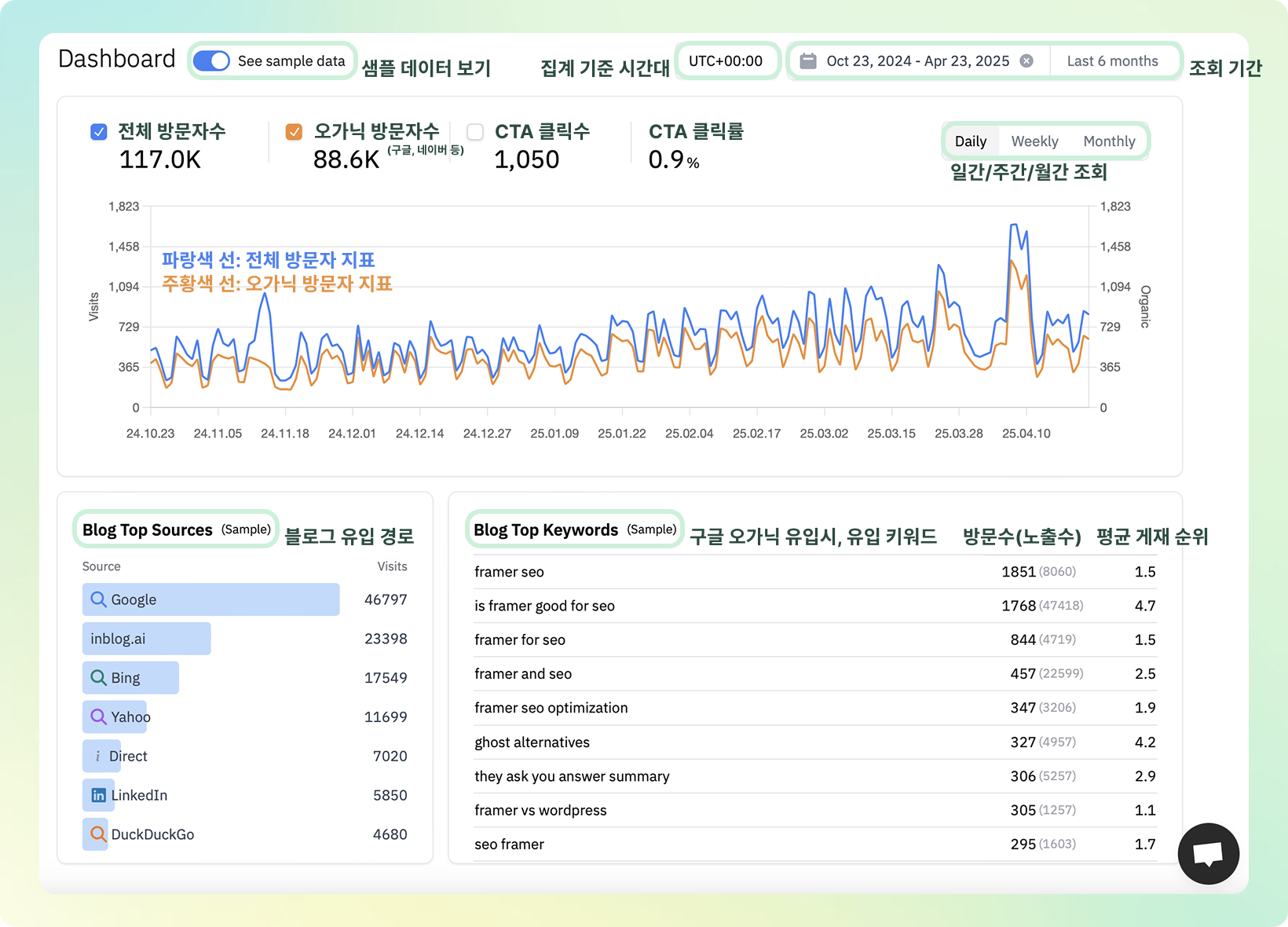: 좌측 상단 토글을 통해 샘플 데이터를 확인할 수 있습니다.대시보드 집계 기준 시간대를 설정할 수 있습니다.