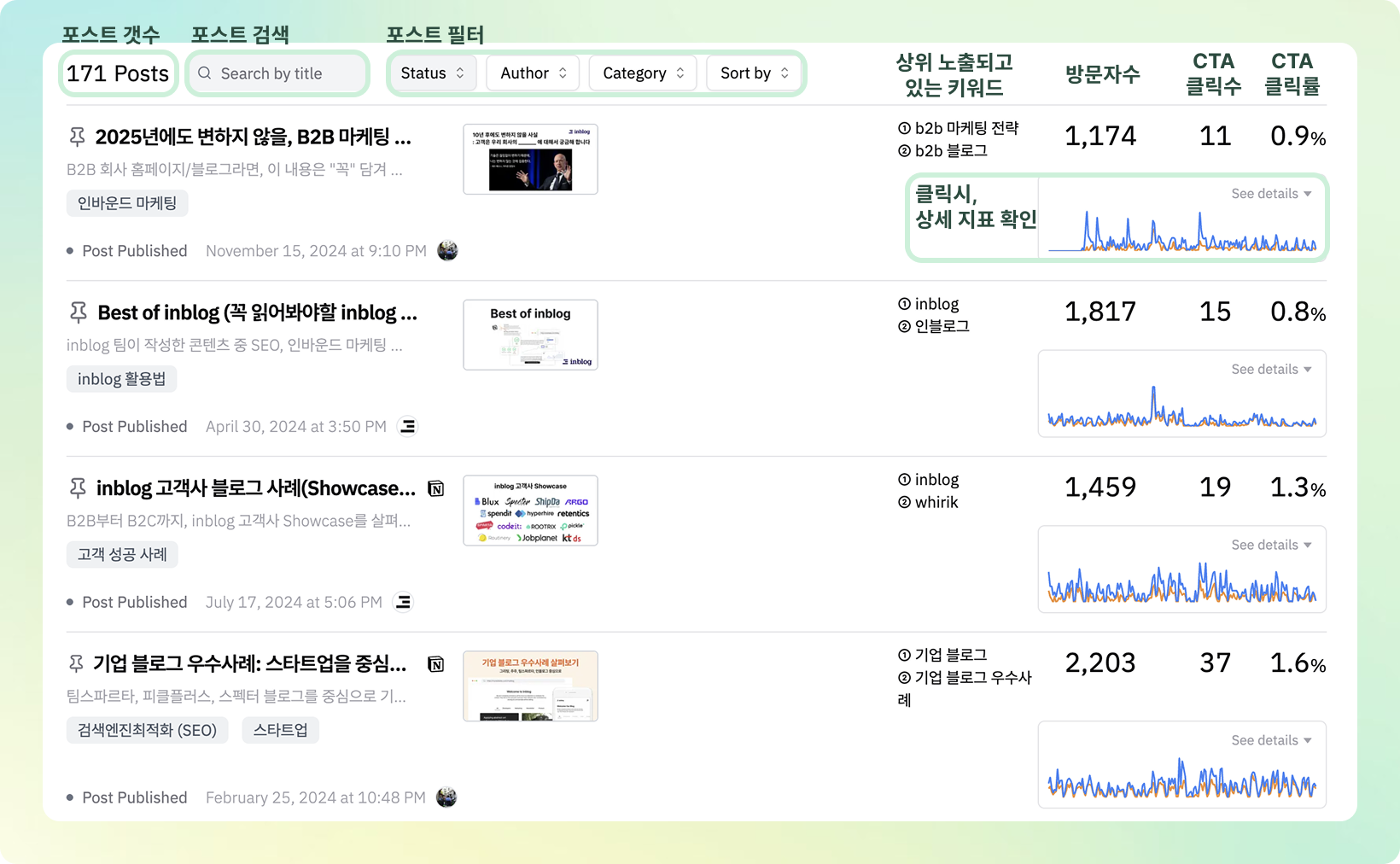 각 콘텐츠별 조회수(visits)와 CTA 클릭 횟수(clicks), 클릭률(CVR, Conversion Rate)을 확인할 수 있습니다. 서치콘솔을 연동해놓으면, 구글에서 해당 콘텐츠가 어떤 키워드로 상위 노출되고 있는지를 살펴보실 수 있습니다.
